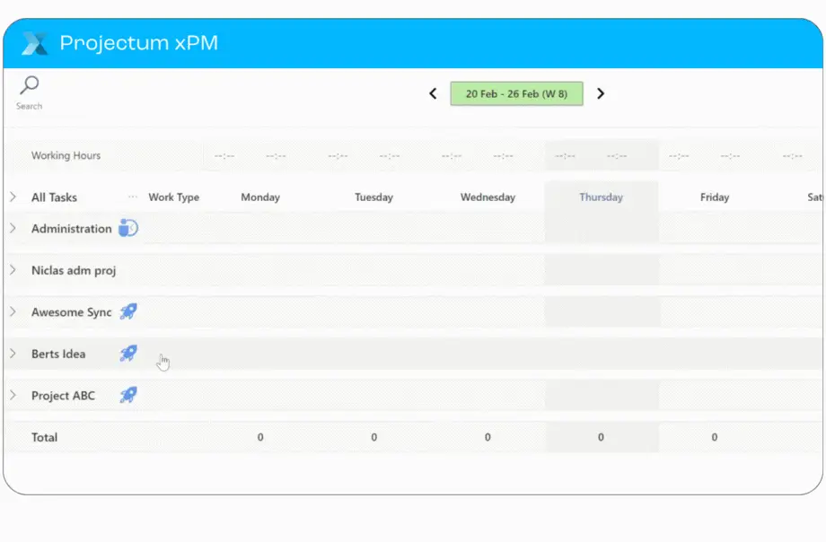 Projectum xPM Time Tracking offre une interface simple avec les fonctionnalités essentielles pour rendre l’enregistrement du temps aussi rapide et facile que possible. Recherchez des projets, copiez la semaine précédente et répartissez les heures hebdomadaires sur les différents jours.