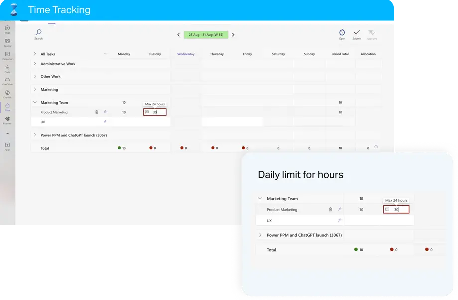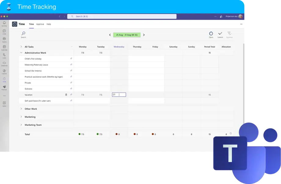 Le suivi du temps doit être simple. C’est pourquoi Time Tracking fonctionne de manière autonome ou directement dans Microsoft Teams. Enregistrez vos heures sans changer d’outil, gardez vos projets sur la bonne voie et assurez-vous que vos données sont toujours à jour, où que vous travailliez.