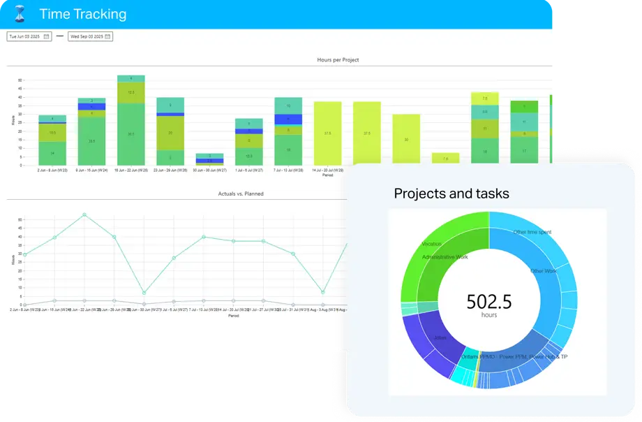 Projectum xPM Time Tracking propose des capacités de reporting complètes. Chaque utilisateur dispose d’un tableau de bord intégré pour analyser son temps sur une période donnée. Vous pouvez générer des rapports détaillés sur le temps passé par projet, par tâche ou par utilisateur. Les données peuvent être analysées pour évaluer la productivité, comparer les heures réelles aux estimations et obtenir des informations utiles pour la prise de décision. Les rapports peuvent être personnalisés, exportés vers Excel ou intégrés à Power BI pour une visualisation avancée.