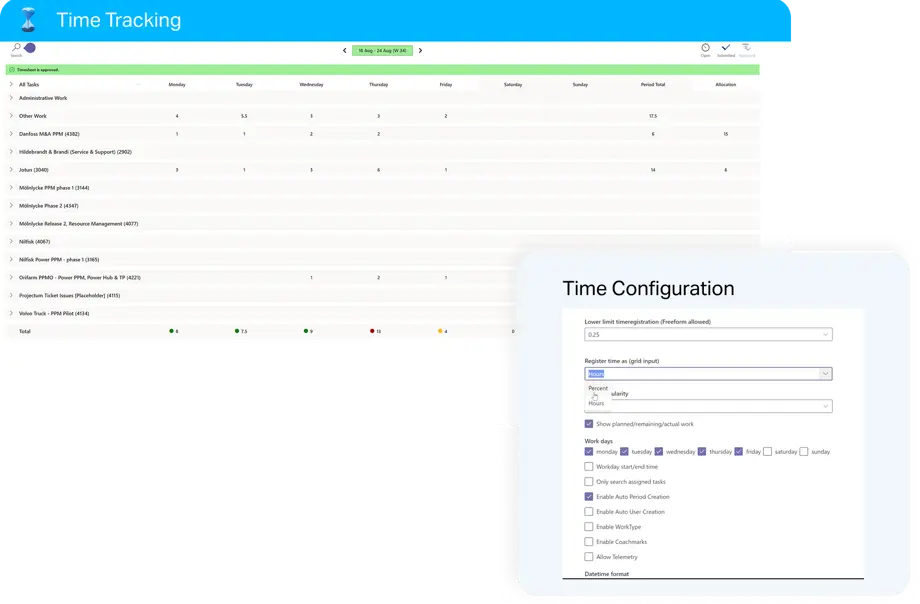 Suivez le temps passé sur les projets, les tâches ou l’administration, et intégrez‑le directement à vos solutions de gestion de projets et de portefeuilles — avec, bien sûr, des options de reporting simples et informatives.